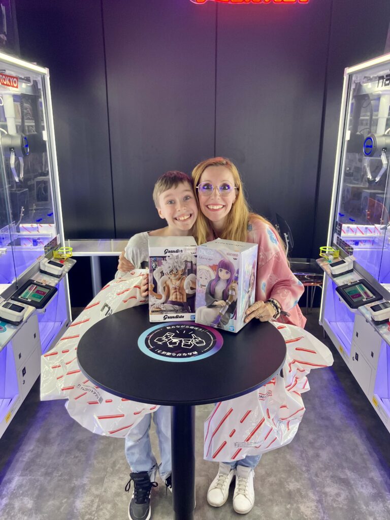 À 15h, on plonge dans Kabukicho. Ici, tout est spectacle. On croise Godzilla perché sur son immeuble, rugissant au-dessus des salles de pachinko. Tyler file vers l’arcade Namco, happé par les lumières, les sons, les couleurs. Il passe d’une borne One Piece à un simulateur de drift sans reprendre son souffle. On le suit du regard, entre amusement et admiration. Il a trouvé son royaume. Après quelques essais, il décroche sa première figurine… puis une deuxième, celle qui faisait briller les yeux de sa mère.