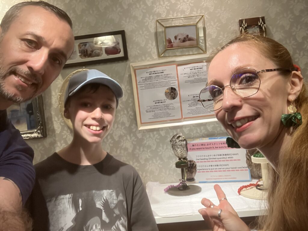Takeshita Street est un choc, même quand on s’y attend. Une ruelle compacte, bondée, saturée de couleurs, de voix, d’enseignes en tous genres. On pousse la porte du Harry Harajuku Café. Réservation faite, heureusement. On passe une heure complète à câliner hérissons, hamsters et hiboux. Tyler est fasciné et Bélinda fond devant un hérisson minuscule.