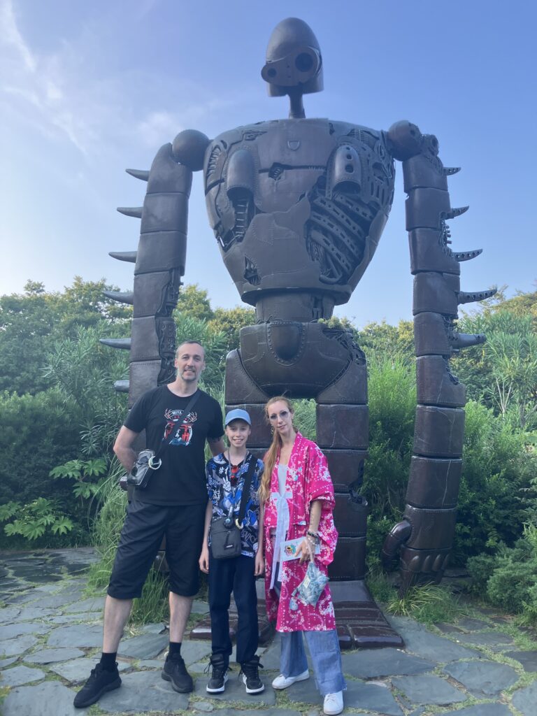 Le musée Ghibli apparaît, recouvert de lierre, comme une maison vivante. À l’entrée, le robot géant du Château dans le ciel veille silencieusement. On entre. On ne prend pas de photos de l’intérieur (c’est interdit), mais chaque pièce devient une image gravée dans la mémoire : le bureau de Miyazaki, les piles de croquis, le chatbus géant pour les enfants, le petit cinéma Saturne avec son court-métrage exclusif, les escaliers qui tournent comme dans un rêve. C’est une immersion totale.