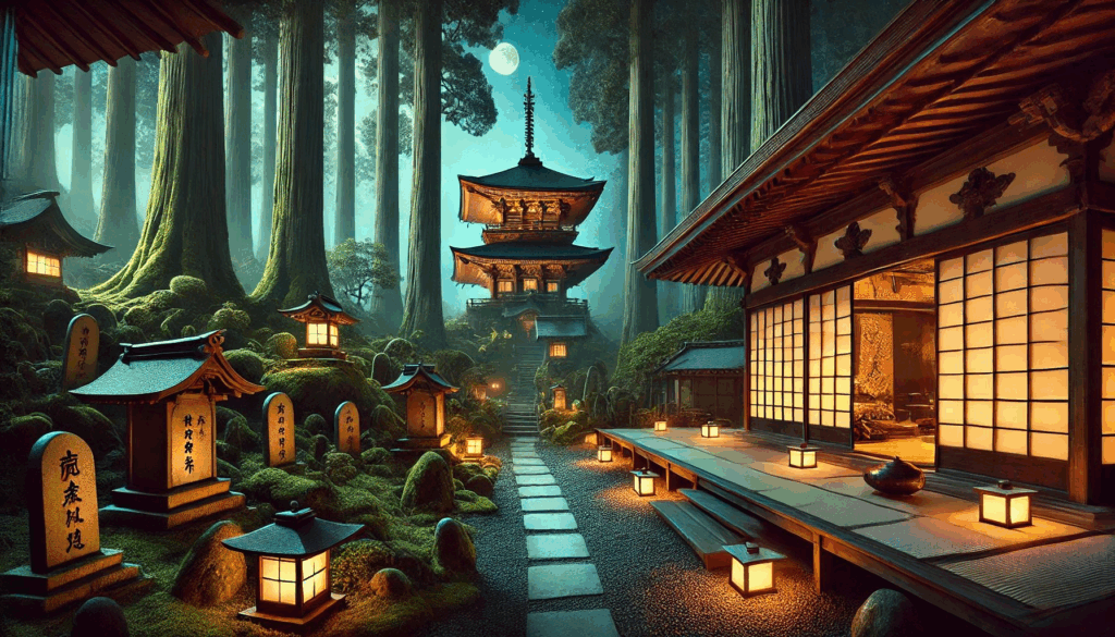 Ce matin réveil au temple dans le calme du mont Kōya. Un moine entonne une prière matinale, chants et tambours résonnent dans l’air frais. Atmosphère solennelle, hors du temps.