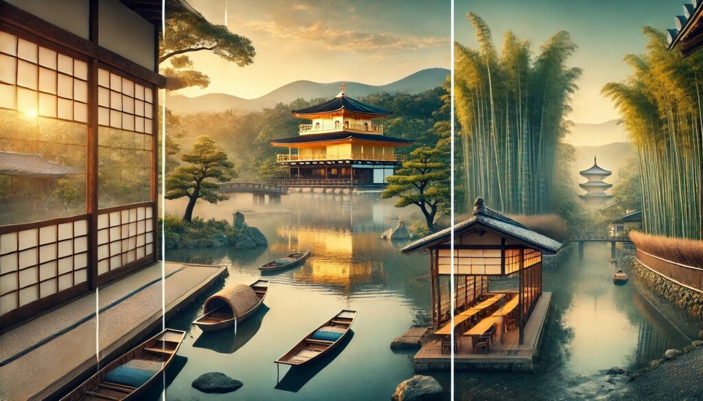 Ce matin on prend le train pour Arashiyama, à l’ouest de la ville. Une demi-heure plus tard, nous voilà face au pont Togetsukyo, toujours aussi calme. La rivière Katsura reflète les montagnes brumeuses. Des barques glissent sans bruit. On fait une photo tous les trois, avec ce pont en toile de fond, comme pour figer ce moment suspendu.