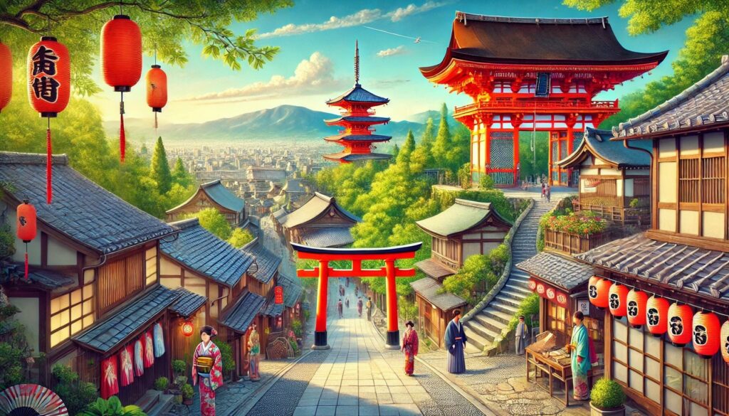 La journée commence tôt, au pied du mont Inari. Le sanctuaire Fushimi Inari nous accueille avec ses célèbres allées de torii vermillon, alignés à perte de vue. On grimpe lentement, dans un silence ponctué par le vent dans les feuilles et le chant des cigales. La lumière filtre entre les portiques, dessinant des ombres mouvantes sur les marches de pierre. Tyler s’amuse à compter les torii, Bélinda s’imprègne de l’atmosphère paisible. Chaque pas nous emmène plus loin dans ce Japon spirituel et intemporel, entre forêt et ferveur.
